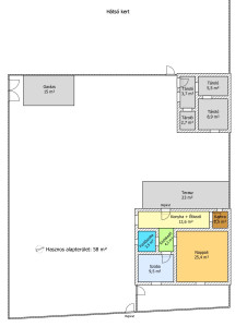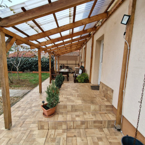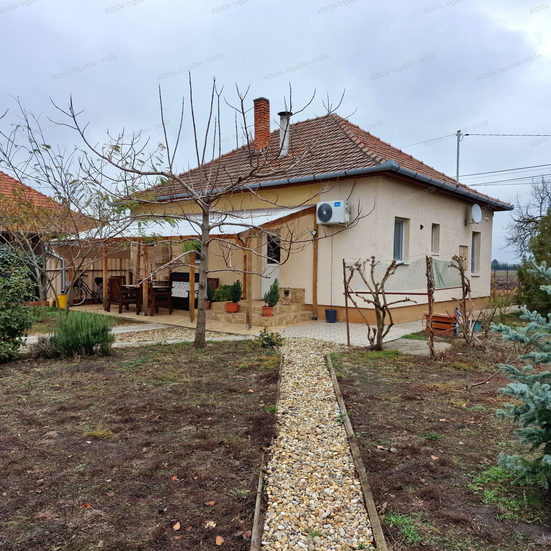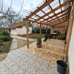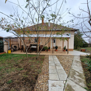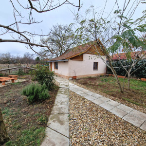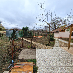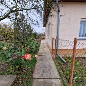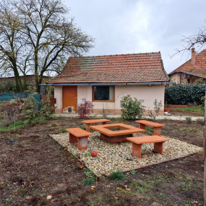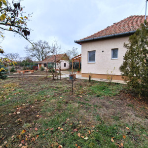 Előkertes családi ház, melynek felújításakor-helyiségek kialakításakor a hosszútávú lakhatást, kicsi rezsit, és élhető otthont álmodtak meg. A nyugati fekvésű fedett, hidegburkolattal ellátott terasz építését, az  elviselhetetlen forró nyár indokolta. A gazdasági épület betonozott, értéket nem képvisel, viszont tárolóként nagyon hasznos egy kertes házban. A gépkocsinak lemeztároló biztosítja a helyet. Öntözésre fúrt kút áll rendelkezésre. Jelenleg a teleknek a 2/5-e hasznosított az építmények, udvar kialakításával, a többi terület bio, fűnyíróval kezelt füves rész.