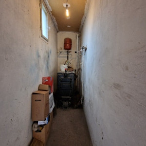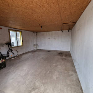 A garázs betonozott, szintén téglából épült, kiürített állapotú. Egy nagyobb méretű autónak, és körben salgó polcokkal ellátva tárolónak is alkalmas.